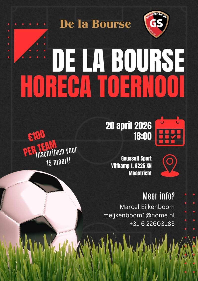 Op maandag 20 april wordt het Hotel De la Bourse Horecatoernooi (7vs7) georganiseerd voor horecabedrijven uit Maastricht en omstreken. Een sportieve, gezellige avond vol competitie & plezier samen met collega’s, vrienden uit de horeca. Mis het niet en geef je op !