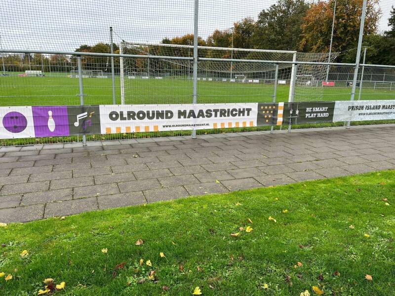 We stelden jullie vorige week via Facebook op de hoogte over onze eerste ‘doeksponsor’ Olround Bowling Maastricht. Er zijn twee meshdoeken achter de doelen gehangen. Op de foto’s het mooie resultaat.