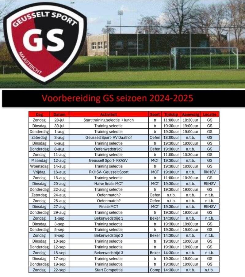 Hier leest u het volledige programma (onder voorbehoud) van de voorbereiding van de selectie. Vanaf de tweede week in augustus zullen ook onze andere teams starten met trainen.